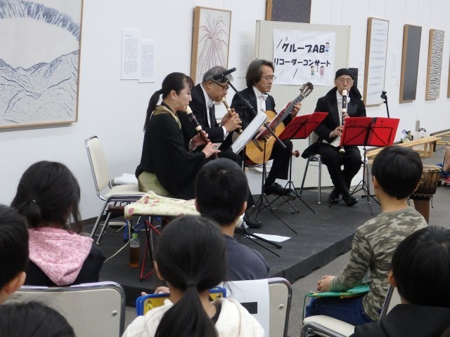 4年生は2~4時間目にトミオカホワイト美術館で3校交流会を行いました。グループABの皆さんによるリコーダーコンサートです。交流を深めるためになるべく他の学校の人と隣り合って座りましたので、少し緊張気...