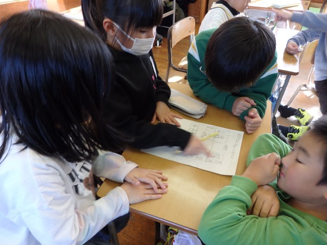 2年生の5時間目は生活の授業でした。町探検のまとめを行いました。チームごとに分かれ、ポスター形式でまとめるために見出しや内容について話し合い、下書きを書いていました。