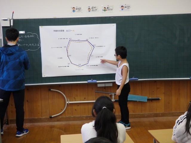 4年生の1時間目は学活の授業でした。自分たちのクラスについて「あいさつ」「5分前行動」「思いやり・協力」など10項目について1人1人が自己評価をした集計結果が提示されました。まずは5月に行った結果と...