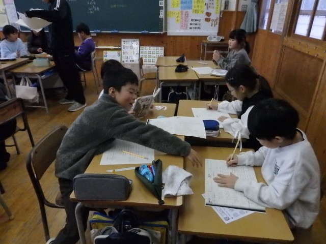 4年生の5時間目は書写の授業でした。「わざ」という字を書いていました。4枚書いて、そのうちの1枚を先生に提出します。書き終わって「どれがいいと思う?」と友だちから提出する1枚を選んでもらっている子が...