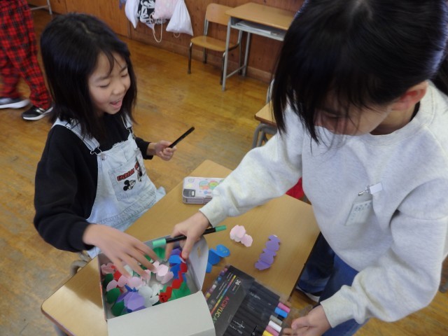 3年生の5時間目は図工の授業でした。3学期の係のポスターを作っていました。メンバーの名前、めあて、仕事内容を書いたら、イラストを描いたり文字に色を塗ったりして飾り付けをしていきました。「グラデーショ...