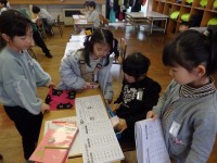 1年生の5時間目は算数の授業でした。「広さ」の学習です。隣の人とペアで陣取りゲームを行っていました。ジャンケンをして勝った人が縦5横5のマス目の中を1マス塗っていきます。ジャンケンを25回戦し終わっ...