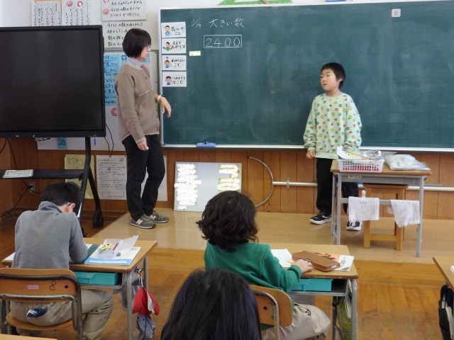 2年生の2時間目は算数の授業でした。「大きい数」の学習です。初めに黒板に2400という数字が書かれ、子どもたちがそこから気付いたことを発表していきました。位取り表を使って「千の位が2、百の位が4・・...