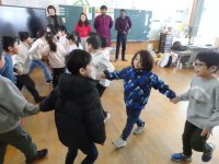2年生の国際交流会、さいごは「かごめかごめ」です。「あのこがほしい」ジャンケンで勝ったチームは大喜びでした。国際大学生と一緒に遊べて、あっという間の45分間でした。