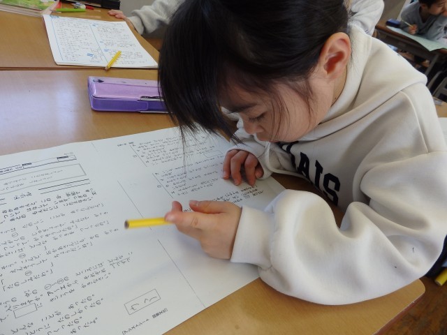 6年生の3時間目は算数の授業でした。「割合」についての学習です。「□mの重さが□gの針金が□あるときの重さは□gです」という文の□の部分にxや数字を入れて、xの値を求める問題を作っていました。近くの...
