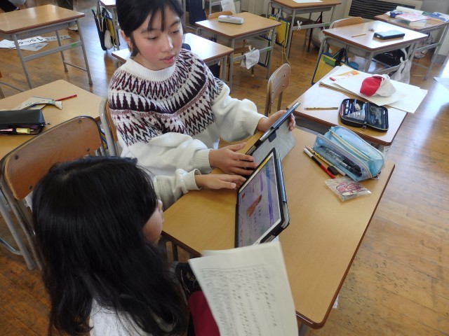 4年生の4時間目は総合の授業でした。3月の学習参観で「第2学習発表会」と題して総合で学んだことを発表するための準備をしていました。iPadでシナリオの入力やスライドの作成をしたり、大道具・小道具を作...