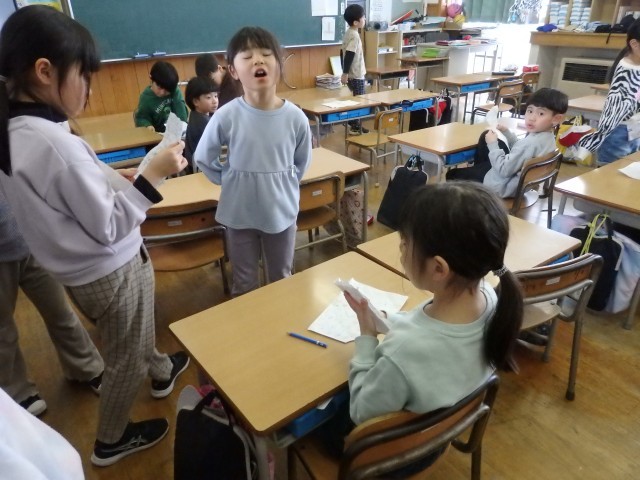 2年生の4時間目は生活の授業でした。「わたしたんけん」という生まれてから現在までの自分の成長の記録を作っています。その中にクラスのみんなからのメッセージを貼るページがあるようで、クラスのみんな1人1...