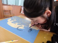 2年生の5時間目は図工の授業でした。紙版画の続きです。清書して描いた絵に、顔の作りや手足などのパーツごとにクシャクシャにしたアルミホイルや段ボールのような凸凹模様が付いた紙を貼っていました。どこにど...