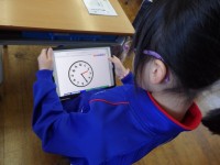 1年生の1時間目は算数の授業でした。時計の読み方の学習です。iPadのドリルパークを使って2人ペアで学習していました。1人の子が時計の針をぐるぐる回して時刻を設定して問題を出します。もう一人の子が時...