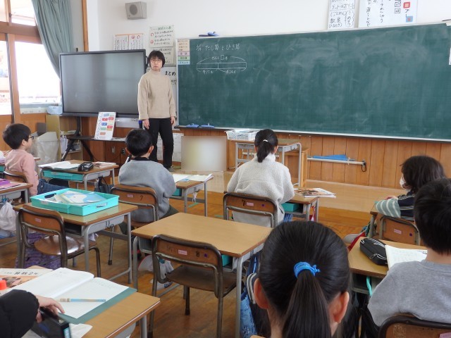 2年生の4時間目は算数の授業でした。「子どもが何人か遊んでいました。あとから26人来たので全部で42人になりました」という文から、テープ図を使って式を考えていきました。□+26=42の式ができ、さら...