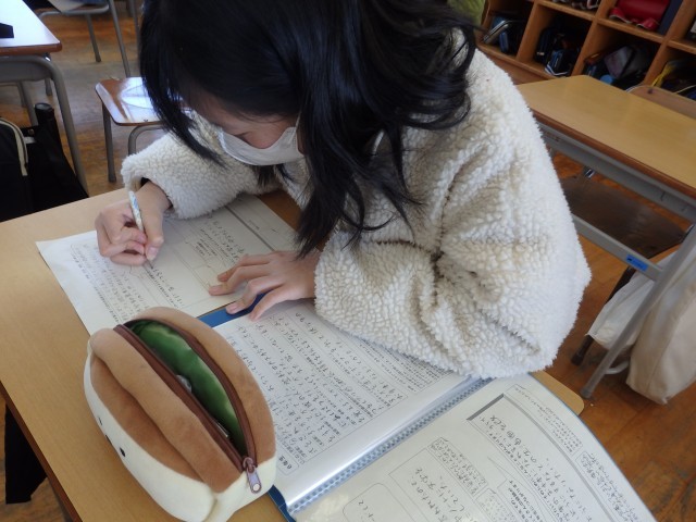 6年生の5時間目は総合の授業でした。前半は、この1年間で学習、生活、家庭生活などのことについて「成長できたこと」や「どんな中学生になりたいか」、「どんなことを頑張りたいか」などについて振り返りました...