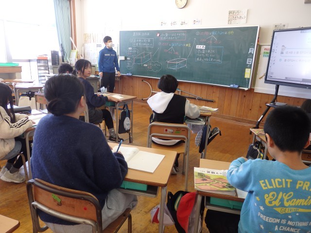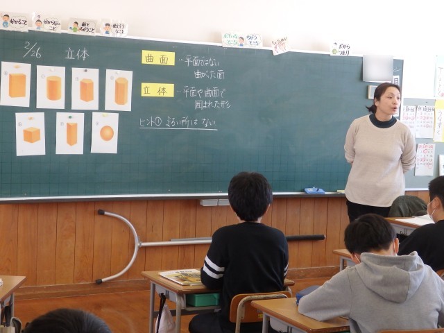 5年生の2時間目は算数の授業でした。7つの立体の図が示されました。先生が7つのうち1つを選び、子どもたちは先生が何を選んだのか予想します。そして先生が「丸いところはない」「正方形や長方形ではない面が...