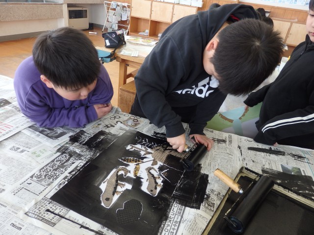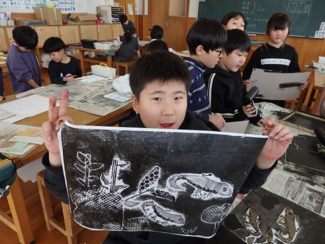 3年生の5時間目は図工の授業でした。紙版画もそろそろ完成に近づいてきました。できあがった版にインクを塗って、バレンでゴシゴシこすります。刷り終わった子や刷る順番を待っている子たちが手伝ってあげている...