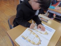 1年生の4時間目は書写の授業でした。静かに書写ノートに取り組んでいました。おしゃべりをする人がなく、シーンと静まりかえった中で集中して取り組んでいました。書く姿勢がいい子がたくさんいました。