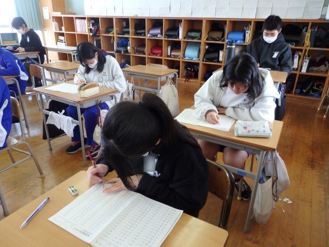 6年生の4時間目は書写の授業でした。今の自分を漢字一文字で表していました。1つの漢字を何度も何度も書いている子もいれば、1枚ずつ違う漢字を何枚も書いている子もいました。「夢」「追」「友」「絆」「叶」...