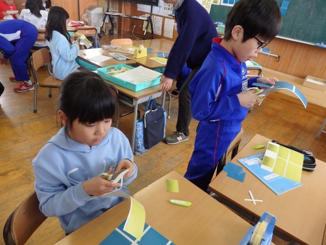 2年生の2時間目は算数の授業でした。「はこのかたち」という立体の学習です。箱の平らなところを「面」ということを学びました。その上で1人1人が「細長い箱」や「サイコロの箱」から好きな箱を選んで、それぞ...