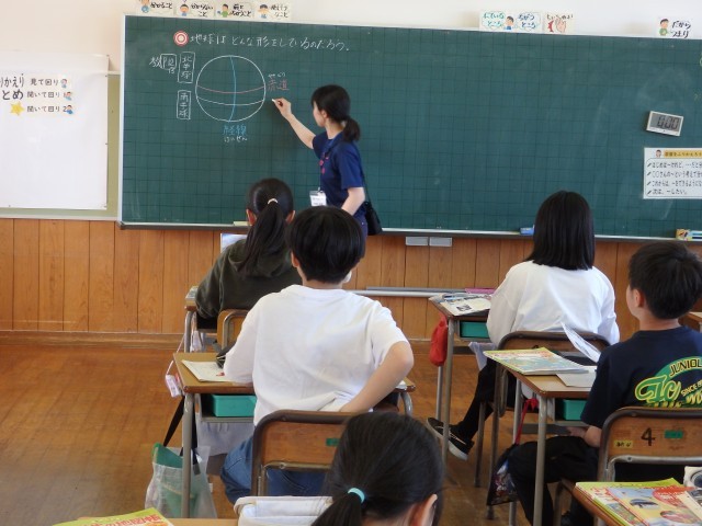 5年生の5時間目は社会の授業でした。「緯度と経度」の学習です。班ごとで地球儀を使って「赤道を通っている国」、「日本と同じ経度の国」、「日本と同じ緯度の国」を探しました。じーっと目をこらして地球儀を見つ...