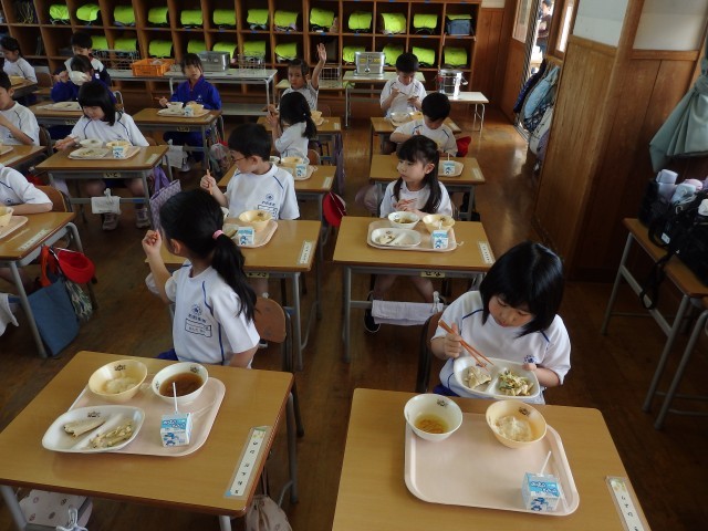 1年生のはじめての給食です。先生が食缶に残っているご飯やサラダ、お汁を「まだ食べたい人?」と聞くと「ハイッ!」と手を挙げる子がたくさんいました。まだ食べたいときに「食べたい」と言えたり、気軽にお替わり...