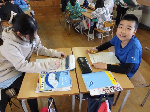 5年生の1時間目は社会の授業でした。「世界の中の日本の国土」の学習です。日本列島を北海道から沖縄までをノートに描いていました。ノート1ページに収まるようにするのが難しいらしく、何度も描き直しをしていま...
