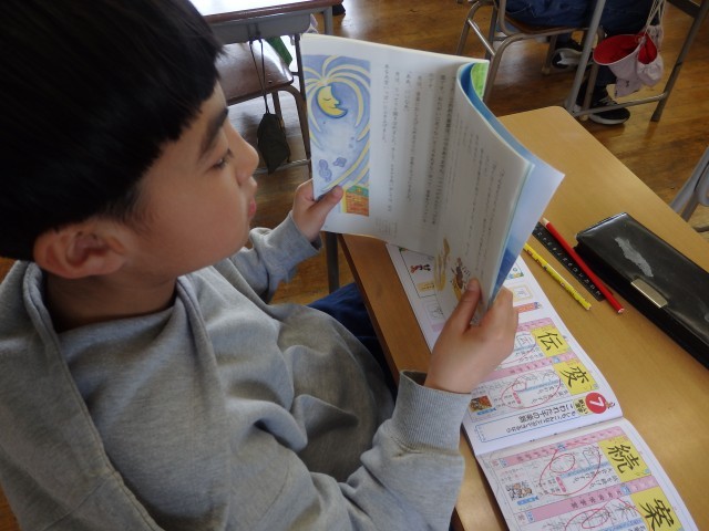 2年生の1時間目は国語の授業でした。「風のゆうびんやさん」の学習です。みんなで丸読みをしました。両手で教科書を持って読む姿勢がいい子がたくさんいました。また、読み終わった感想も書きました。「いいな」と...