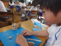 2年生の2時間目は図工の授業でした。「にぎにぎねんど」の学習です。ねん土をにぎにぎと握ってできた形をもとに好きなものを作ります。ロボット、ライオン、お寿司、飼っている犬などを作っていました。お子さんは...