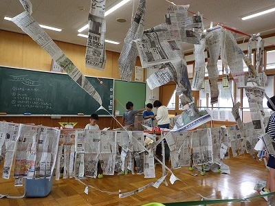 2年生の図画工作の授業の様子です。「つないでつるして」を学習しました。新聞紙を切り、どんどんとつないでいきます。つなげた新聞紙を教室内に吊るします。瞬く間に、教室が芸術空間となりました。驚くような劇的な変化でした。短時間で作り上げた制作に2年生は大喜びでした!