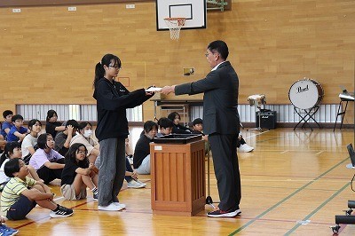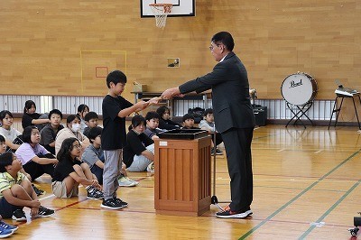 10月は「いじめ見逃しゼロ強調月間」です。全校朝会で校長先生から、「いじめを受けている人には、周囲の人たちの行動がとても大切です。」と話がありました。上田小学校全員が笑顔な学校であってほしいです。また、後半には「児童生徒標本展」「親善陸上大会」の表彰がありました。