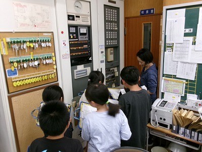 3年生は社会科の学習で防災設備について学んでいます。学校内にはどんな防災設備があるのだろうか?ということで、校内の防災設備を調べることにしました。まずは職員室です。防災扉が閉まった時、ブザーが鳴りその箇所が点滅する設備を見ました。また、校内には消火器が所々に置いてあることも確認をすることができました。