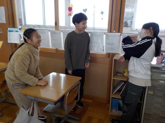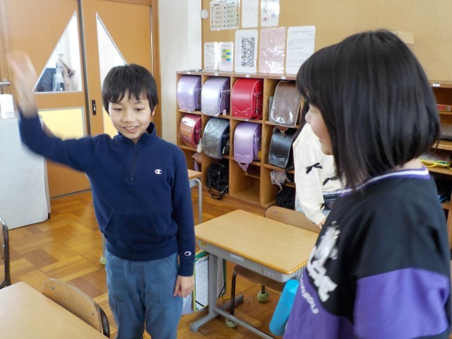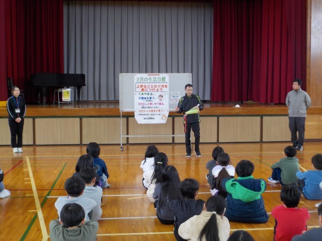 にこにこ集会をしました。2月の生活目標は、「上手な断り方を身につけよう」です。集会では、友だちから遊びに誘われた時の断り方について、ドラえもんの「のびたの言い方」「ジャイアンの言い方」「しずかちゃんの言い方」で職員が劇を演じ、望ましい断り方についてみんなで考え、確認しました。集会後、4年生は、掃除の場面を想定して、ペアで断り方のロールプレイをしました。