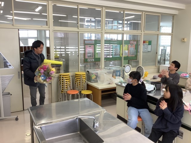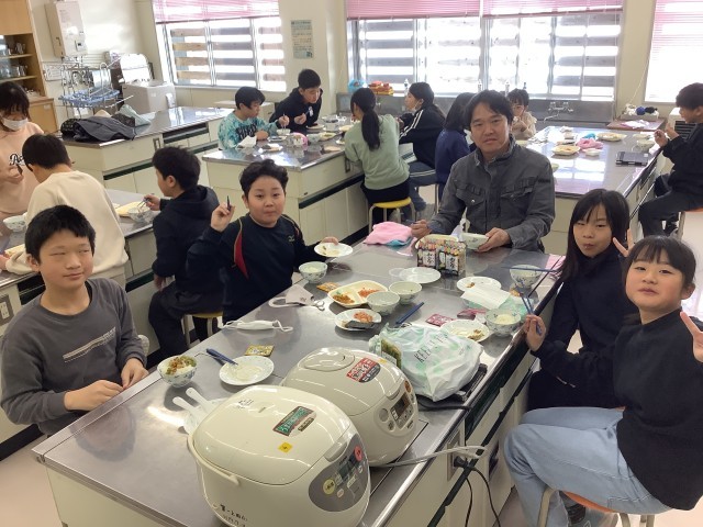 5年生がお米の試食会をしました。1学期からお米作りでお世話になった上村さんを招き、炊きたてのご飯にふりかけをかけたり、きりざいをのせたりしていただきました。田植えから稲刈りまで大切に育てたお米、最高においしかったでしょう!!いつも優しく丁寧にサポートしてくださった上村さん、本当にありがとうございました!!