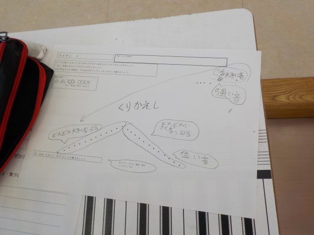 次に、気に入った部分について想像したライオンの様子を書いて、図形楽譜を書きました。