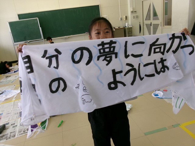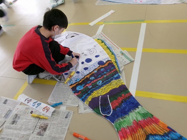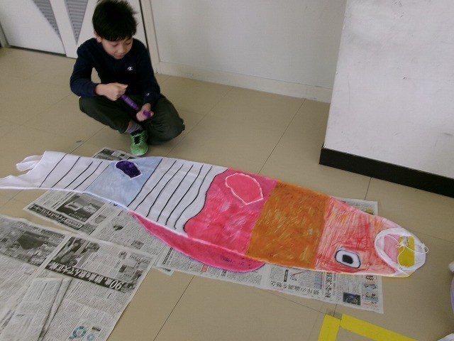 4月の中旬に学校近くの公園にたくさんの鯉のぼりが飾られます。主催団体様より、「ぜひ上田小学校の子どもたちもオリジナルな鯉のぼりを作ってみませんか?」とお願いがありました。そこで、4年生が1人1枚の鯉のぼりを作っています。鮮やかな色で塗る子ども、自分の夢を書く子ども、様々です。天高くそれぞれの鯉のぼりが上がることを今から楽しみにしている4年生です。