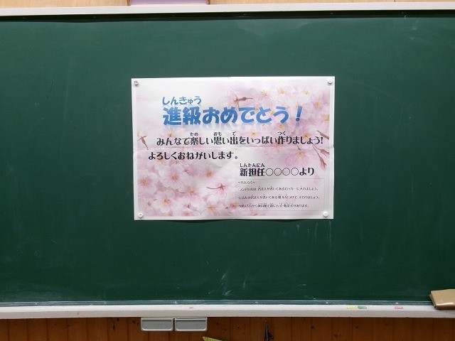 明日は令和8年度、1学期始業式です。2年生から6年生が登校してきます。各学級や廊下には「進級おめでとう」の飾り付けがされています。準備万端、整いました。職員一同、子どもたちが元気良く登校してくることを楽しみにしています。