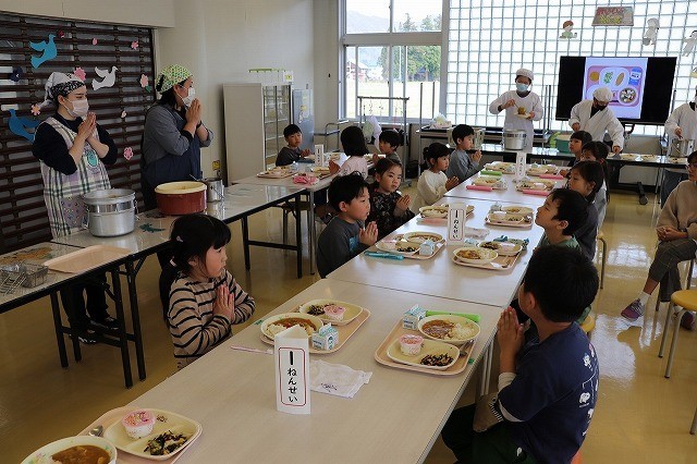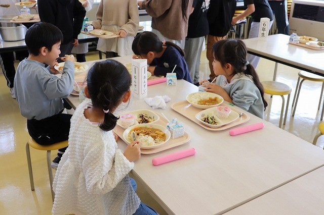 1年生の給食が始まりました。本日のメニューは、ポークカレーです。1年生は大きな口を開けておいしそうに食べていました。給食の時間が終わりに近づいてくると、6年生が牛乳パックのたたみ方を親切に教えてあげる姿も見られました。