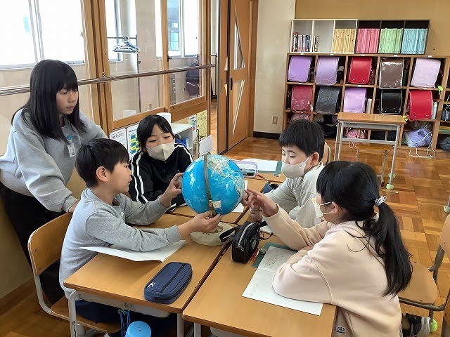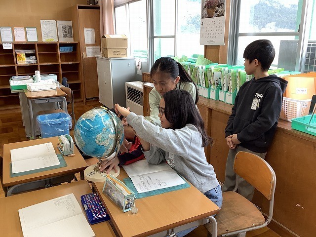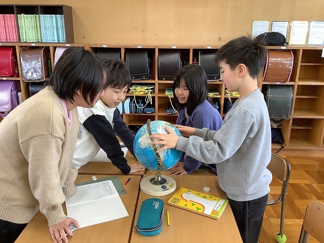 5年生の社会科の様子です。「日本の国土とわたしたちのくらし」を学習しています。地球儀を活用して日本の位置、日本の周辺国等について学習を深めました。今後、様々な国や大陸、島は、世界地図と地球儀で、形や大きさにどのような違いがあるのかを見比べていきます。