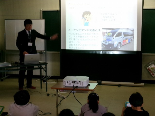 5,6年生が、4月から始まった「MOSS」について学びました。「MOSS」とは、「MINAMIUONMA ONDEMAND SHUTTLE SERVICE」の略です。上田地区から導入されました。今後の路線バスの運転手不足、高齢化社会等を理由として開始されました。市の交通政策室の職員の皆様方から来校していただき、「MOSS」の活用方法等について詳しく説明をしていただきました。