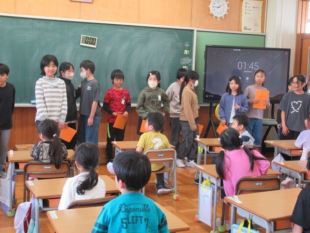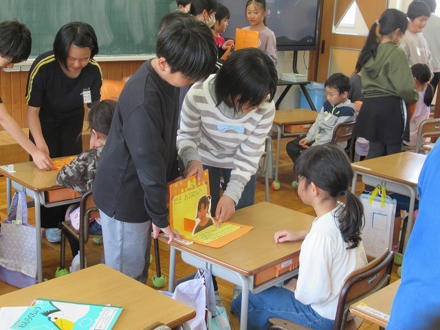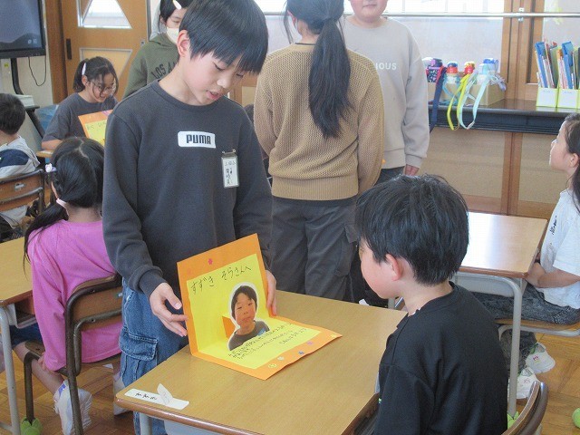 1年生を迎える会が来週に予定されています。5年生が招待状を作成し、1年生に届けました。招待状は1年生の顔写真入りです。丁寧に作成された招待状に、1年生は大喜びです!5年生は高学年となり、お姉さん、お兄さんとして1年生に優しく接している姿が印象的でした。