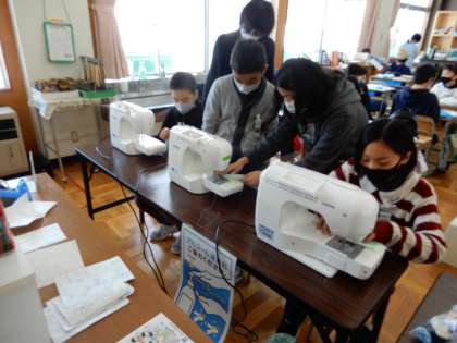 ミシンには、ボビンの付け方や上糸と下糸の調整、縫い終わりの始末の仕方など、たくさんの学習事項があります。5年生はよく話を聞き、着実にやり方を覚えていました。
