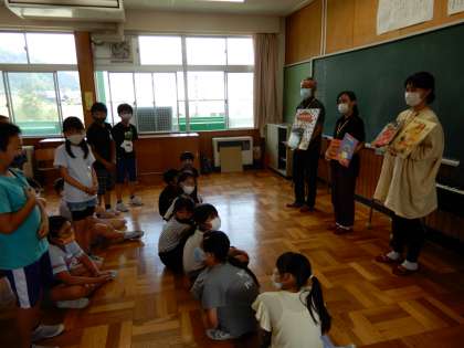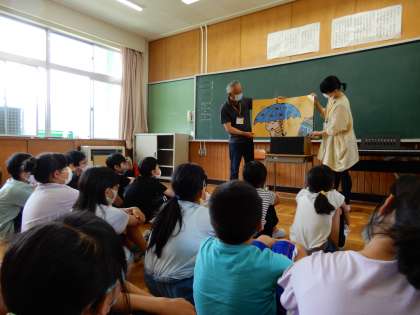 4年生の感想タイムでは、「『オニのふろめぐり』で、風呂に桃太郎が入ってきたのが面白かったです。」「『ふしぎなカサやさん』で、豚の傘を開いたら豚がたくさん落ちてきてビックリしました。」という内容についての感想だけでなく、「読むときの声の大きさやスピードがちょうどよかったです。」などという読み方への感想もあり、よい学習になったことが伝わってきました。