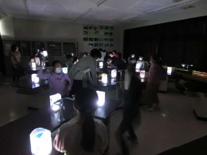 今日は、暗幕をした理科室にでき上がった作品を並べ、光らせました。他の学年の子どもたちも招待した展示会は、多くの子どもたちでにぎわいました。ぜひ、自宅でも飾ってほしいです。