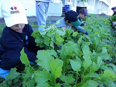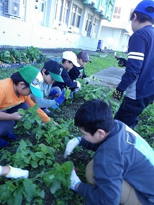 2年生が学校の畑で育てていたラディッシュを収穫しました。かなりたくさん収穫をすることができました。葉が伸びすぎてラディッシュを探すのに苦労しましたが、2年生みんなで協力をして収穫をしました。さて、どんな調理をするのでしょう。楽しみですね。