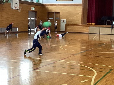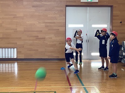 3,4年生は体育の学習でハンドベースボールをしています。ボールがドッチボールのボールに変わっただけで、あとは野球と同じルールで学習しています。的は大きくなって打ちやすいのですが、打ってもなかなか前にボールが飛びません。また、ボールを投げても思うようなところにボールが届きません。チームで作戦を立てながら、楽しく活動をしています。