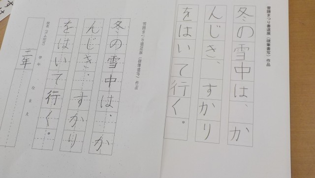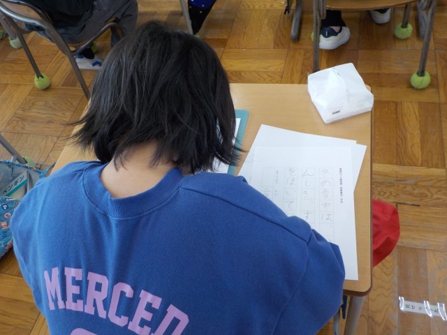 2年生の書写の時間です。雪譜祭り書道展や校内書き初め展に向けて、練習に取り組んでいます。1・2年生は、硬筆の作品になります。担当の先生にポイントを教えてもらいながら繰り返し練習し、どんどん上手になってきました!作品展がとても楽しみです!