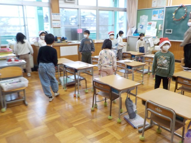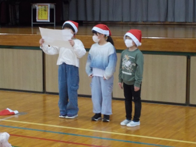 1年生がクリスマス会を開きました。みんなで、楽しく宝探しやドッジボールなどをしました!それぞれゲーム担当の子どもたちが、サンタクロースの帽子をかぶって、ゲームの説明や進行をとても上手に進めていました!