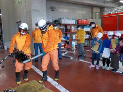 集会をするホールや食堂、更衣室などを見せていただきました。また、通信指令室では、上田小学校から救急車を要請するという想定の訓練を見せていただきました。