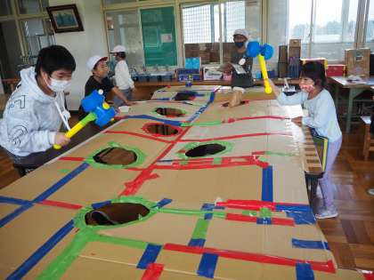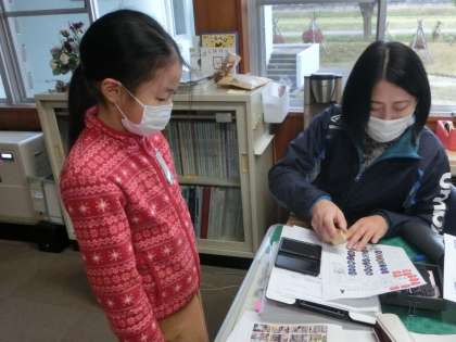 そしていよいよ出店の開始です。教室や特別教室、体育館で開いた出店には、たくさんの子どもたちや職員が訪れました。受付をする子やゲームの説明をする子、点数を数える子、点数を記録する子など、低中高学年が事前に決めた役割をしっかりと果たしていました。