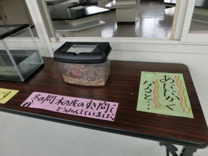 上田小学校では、理科室前にはときどき、子どもたちの興味をひく物を置きます。