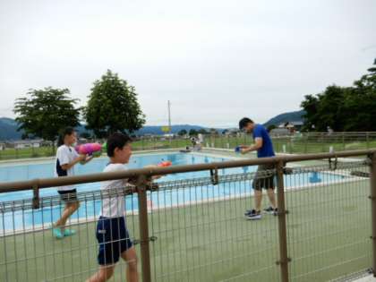清掃が終わると、今年度は特別に「水遊びタイム」を設けました。家から持ってきた水鉄砲や、学校のバケツ、ホースを使って水を掛け合いました。とても楽しいひとときになりました! -