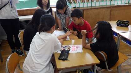 1年生は図工の学習で、「ぱくぱっくん」を制作しています。色紙を思い思いに切り取ったり、貼ったりして制作をしています。思い通りの作品が仕上がり、満足そうな1年生でした。