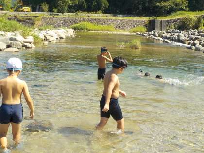 探検の最後には登川で水遊びもしました。暑い日中の時間帯でしたが、川の水はとっても冷たくて気持ちよかったです。